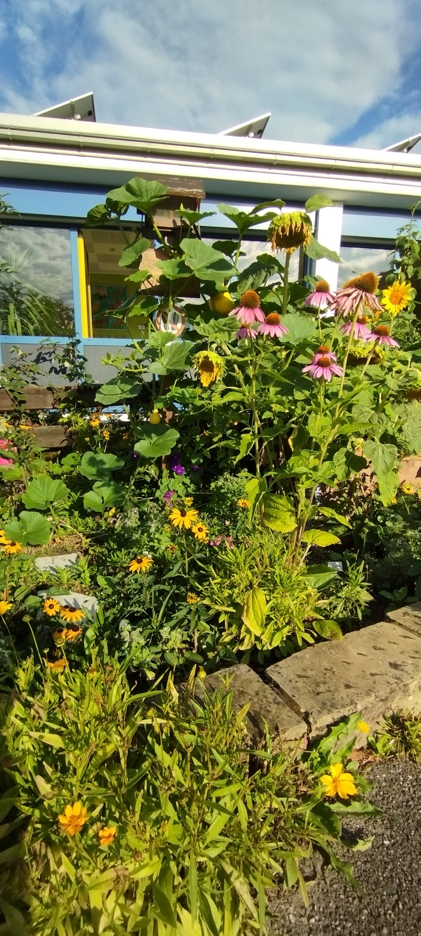 Im März und April 2019 setzten wir Erdbeerpflanzen ins Hochbeet. Direkt in den Garten pflanzten wir verschiedene Sträucher und Kräuter, sowie Blumen. Die vorgezogenen Pflanzen setzten wir im Mai ins Freie und freuten uns darüber, wie alles wunderbar wuchs. Das war selbstverständlich nur möglich, weil überflüssige Wildkräuter gejätet und viel gegossen wurde. Erdbeeren und Himbeeren vernaschten die Kinder besonders gern. Aber auch die süßen kleinen Tomaten verschwanden gleich nach dem Pflücken im Mund. An heißen Tagen gab es frischen kalten Kräutertee aus Pfefferminze, Zitronenmelisse und Salbei. Zuletzt ernteten wir 15 Stück Hokaido Kürbisse, die sogar in der Hecke und über den Lichtschacht wuchsen.
